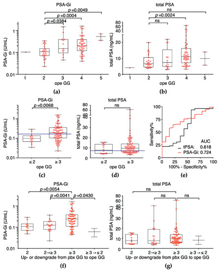 The serum PSA-Gi levels at Pbx in PCa patients who underwent RP. (a) PSA-Gi levels before Pbx among PCa patients classified by the grade group after RP (ope GG); (b) total PSA level before Pbx of PCa patients classified by the ope GG; (c,d) PSA-Gi and total PSA levels before Pbx between patients with ope GG ≤ 2 and ope GG ≥ 3. Cutoff levels at 60% sensitivity of PSA-Gi and/or total PSA is presented as a blue dotted line; (e) ROC curve analysis of total PSA and PSA-Gi in PCa patients with ope GG ≤ 2 and ope GG ≥ 3. The AUCs for the prediction of patients with ope GG ≥ 3 of PSA-Gi and total PSA were 0.724 and 0.618, respectively; (f,g) PSA-Gi and total PSA levels in patients with a GG upgrade from 2 at Pbx to ope GG ≥ 3 and a GG downgrade from ≥3 at Pbx to ope GG ≤ 2.