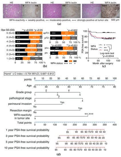 Immunohistochemical analysis of RP specimens using WFA lectin and post-operative nomogram predicting PSA-free survival probability. (a) Representative hematoxylin-eosin (HE) staining and WFA reactive-glycan expression of tumors of RP specimens. WFA-reactivity was classified into three groups: weakly positive, moderately positive, and strongly positive at a tumor site, respectively. Scale bar indicated 500 μm; (b) association between with WFA-reactive glycan expression and ope GG (ope GS), pathological stage, and perineural invasion-status; (c) PSA-free survival was evaluated using Kaplan–Meier curves and differences between three groups were assessed using the log-rank test. Patients with tumors strongly or moderately positive for WFA had a much shorter period of PSA recurrence after RP than did patients with tumors weakly positive for WFA; (d) Cox hazard regression analysis-based post-operative nomogram predicting PSA-free survival probability after RP. The c-index (0.754, 95% CI, 0.697–0.812), which is similar to the area under a receiver operating characteristic curve, was used to estimate the discrimination ability of the nomogram [25].