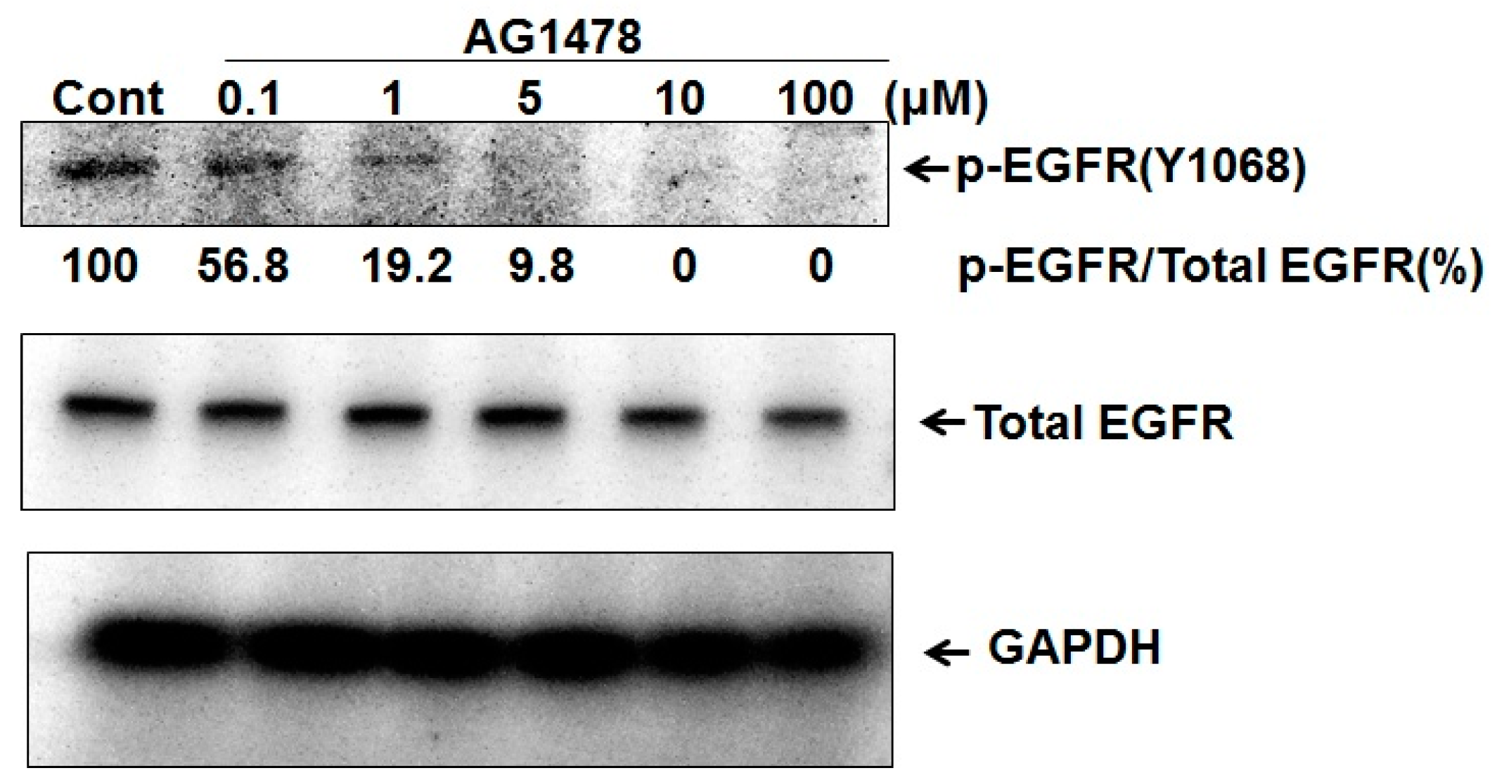 AG1478 suppressed p-EGFR level in dose-dependent manner in HSC-4 cells. Subconfluent HSC-4 cells were incubated for 24 h in serum-free medium. After the starvation, cells were treated with variable concentrations of AG1478 for a 1 h incubation. The AG1478-treated HSC-4 cells were further incubated for 15 min with 10 ng/mL of epidermal growth factor (EGF). Whole-cell extracts were analyzed by Western blot using antibodies against p-EGFR and EGF receptor (EGFR).