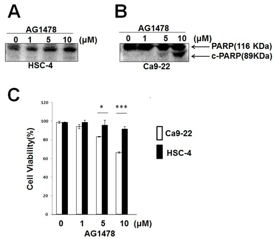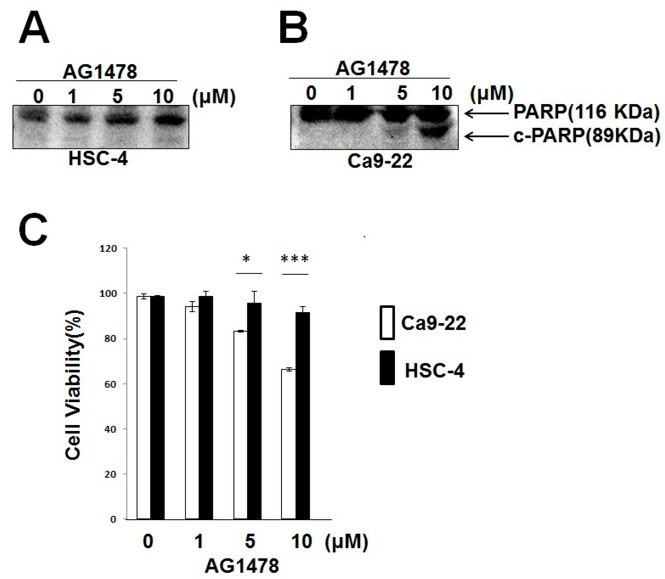 AG1478 did not induce apoptosis in HSC-4, but induced apoptosis in Ca9-22 cells. Subconfluent cultures were incubated with AG1478 for 72 h in the presence of 10% FBS without serum starvation. Western blot was performed to detect the cleaved-PARP (c-PARP) after AG1478 treatment in HSC-4 (A) and Ca9-22 cells (B); (C) Trypan-blue exclusion assay was performed to measure cell viability of HSC-4 cells for 72 h after AG1478 treatment. Cell viability (%) was calculated by viable cell number/total cell number (viable and dead cells) at each concentration. The values were expressed as the means ± SE (a representative of at least three independent experiments). * p < 0.05, *** p < 0.001.