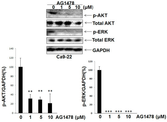 AG1478 suppressed p-ERK and p-AKT levels in Ca9-22 cells. Subconfluent Ca9-22 cells in DMEM + 10% fetal bovine serum (FBS)were treated with or without AG1478 for 2 h in the presence of 10% FBS without serum starvation. Whole-cell extracts were analyzed by Western blot using antibodies against p-AKT and p-ERK. Intensities of Western blot signals were quantified by densitometric analyses. The values were expressed as the means ± SE (a representative of at least three independent experiments). ** p < 0.01, *** p < 0.001.
