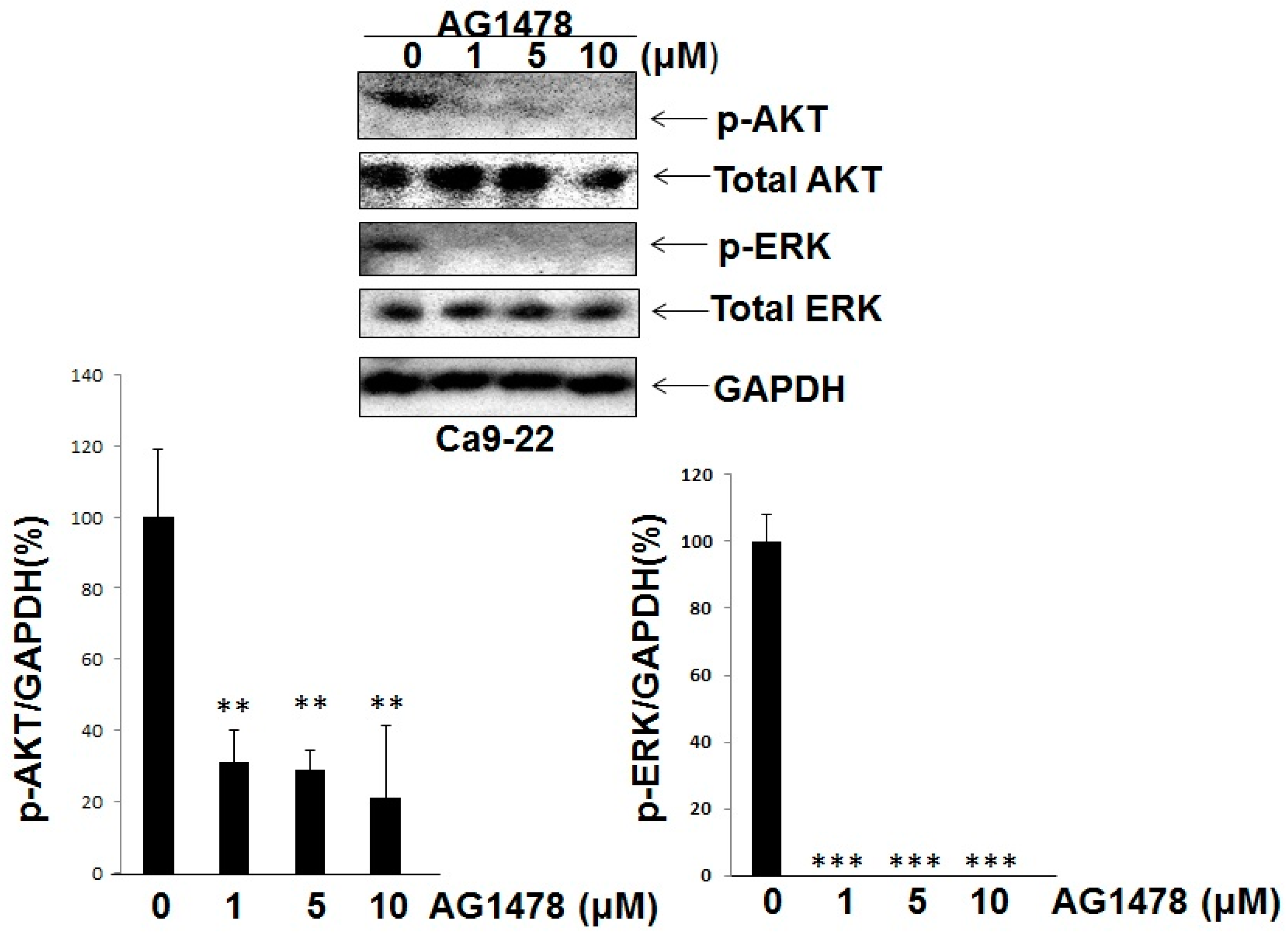 2.1.3. While AG1478 Suppressed the Expression of Both Phosphorylated ERK and AKT in Ca9-22 Cells (WT PIK3CA), AG1478 Suppressed the Expression of Phosphorylated ERK and Did Not Significantly Suppress the Expression of Phosphorylated AKT in HSC-4 Cells (Mutant PIK3CA)
