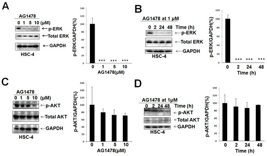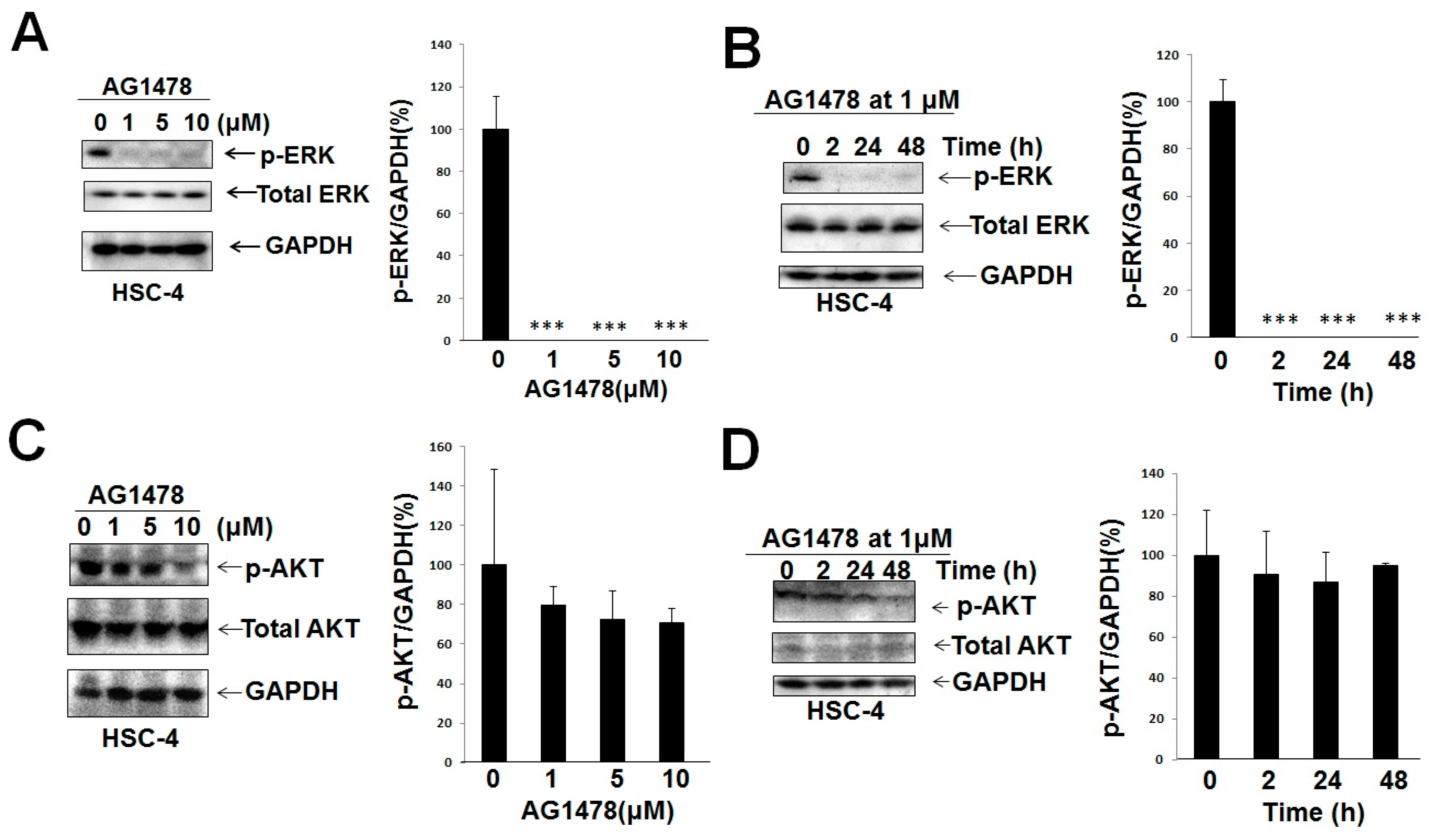 AG1478 did not significantly suppress p-AKT level but suppressed p-ERK level in HSC-4 cells. Subconfluent HSC-4 cells in DMEM + 10% FBS were treated with or without AG1478 for 2 h in the presence of 10% FBS without serum starvation. Western blot was performed to detect p-ERK (A,B) and p-AKT (C,D) levels in HSC-4. Intensities of Western blot signals were quantified by densitometric analyses. The values were expressed as the means ± SE (a representative of at least three independent experiments). *** p < 0.001.