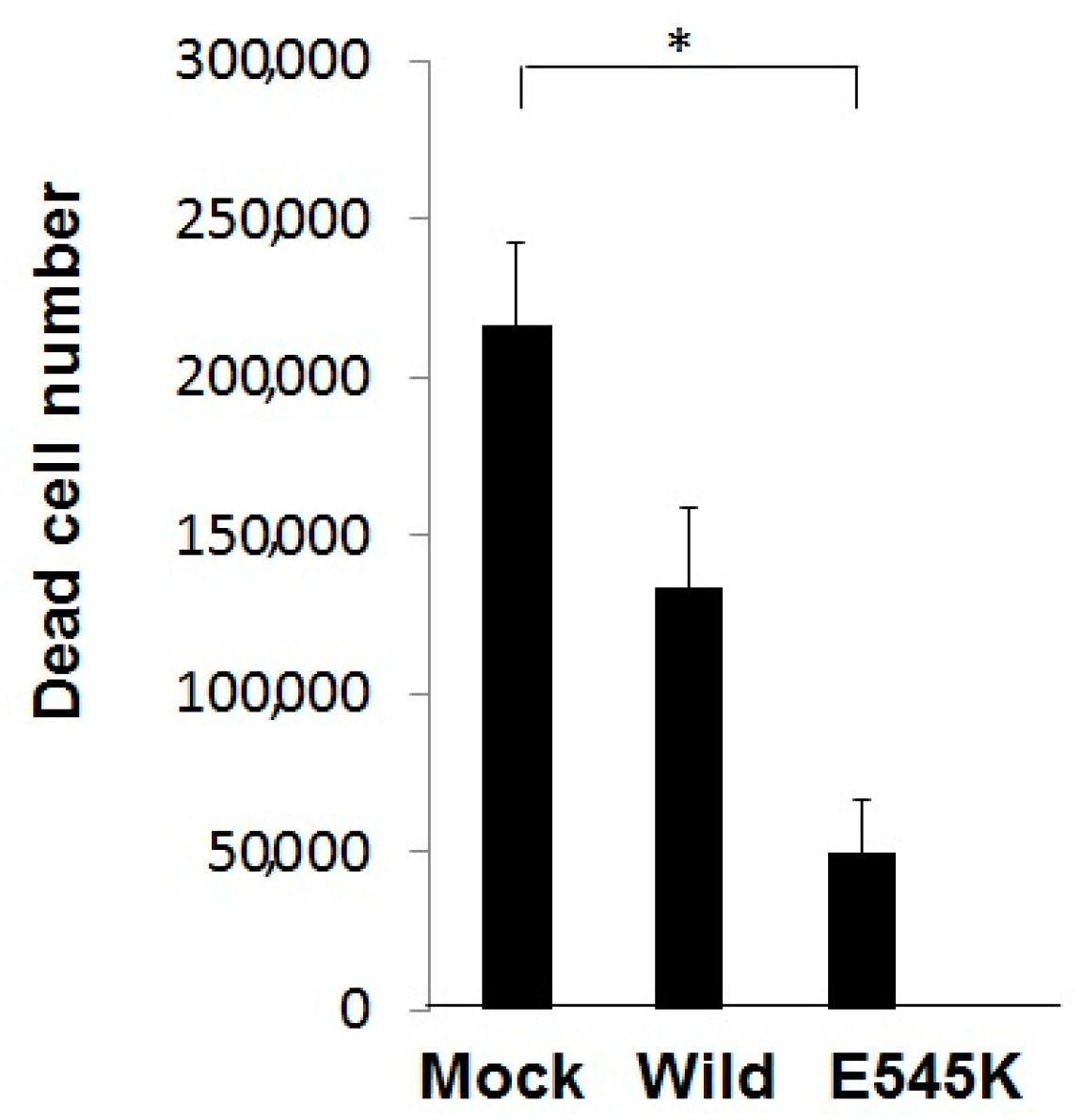 The sensitivity of HNSCC cells to AG1478 depends on PIK3CA gene status. Ca9-22 cells were transfected with the expression vector as follows: Empty vector (Mock), wild-type PIK3CA (Wild), or PIK3CA mutant (E545K). Each transfectant was treated with AG1478 (10 μM) for 72 h, and analyzed for cell viability according to the Trypan blue exclusion method. The values were expressed as the means ± SE (a representative of at least three independent experiments). * p < 0.05.