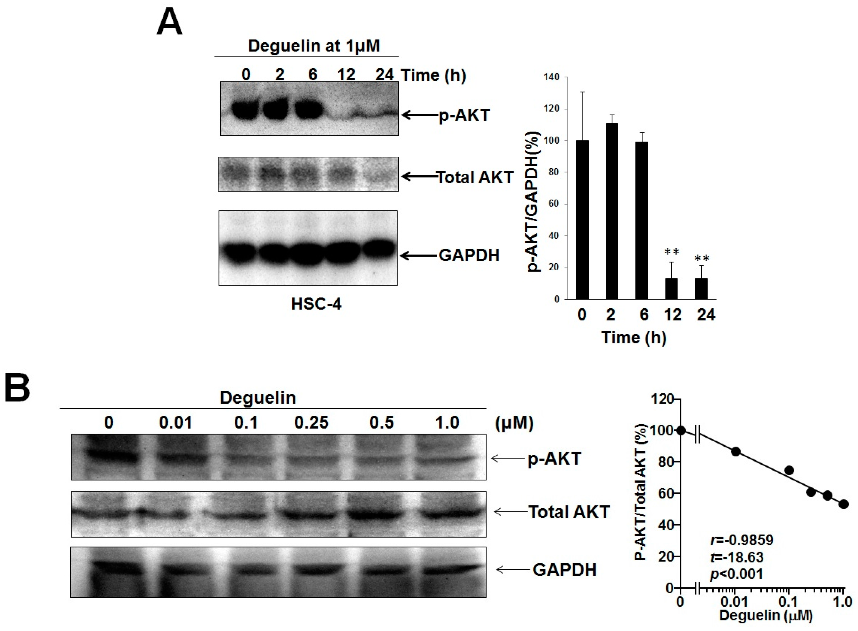 Deguelin suppressed p-AKT level in a time- and dose-dependent manner in HSC-4 cells. Subconfluent HSC-4 cells in DMEM + 10% FBS were treated with or without deguelin in the presence of 10% FBS without serum starvation: Time course study at 1 μM (A), dose-dependency during 12 h incubation (B). Western blot was performed to detect p-AKT levels in HSC-4 cells. Intensities of Western blot signals were quantified by densitometric analyses. The values were expressed as the means ± SE (a representative of at least three independent experiments). ** p < 0.01.