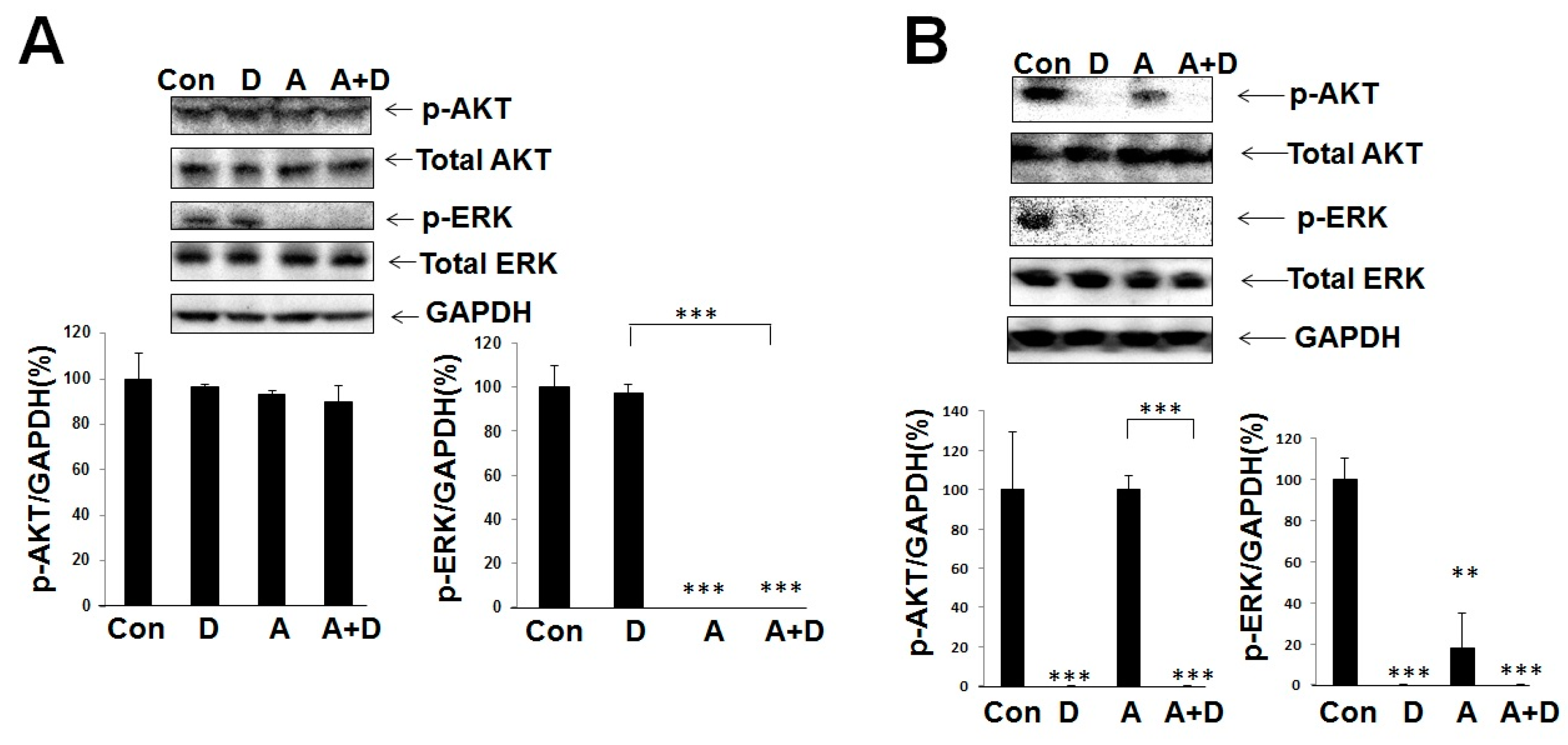 Deguelin and AG1478 show a combination effect on p-AKT and p-ERK levels. HSC-4 cells were incubated in the presence of deguelin (1 μM) and/or AG1478 (1 μM) for 2 h (A) and for 12 h (B). Western blot was performed to detect p-AKT and p-ERK levels in HSC-4 cells. Intensities of Western blot signals were quantified by densitometric analyses. The values were expressed as the means ± SE (a representative of at least three independent experiments). Con, control; D, deguelin; A, AG1478; A + D, AG1478 and Deguelin. ** p < 0.01, *** p < 0.001.