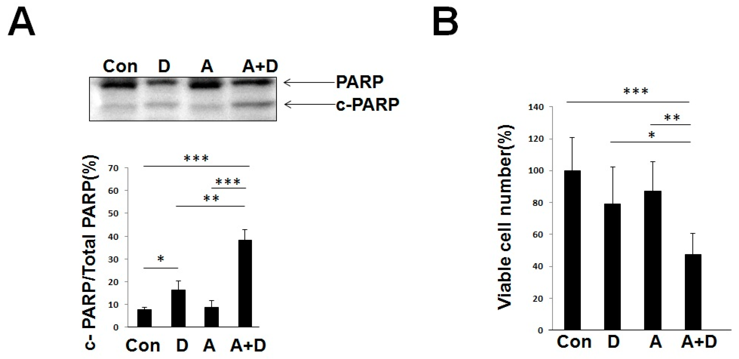 Deguelin and AG1478 show combination effects on the viability of HSC-4 cells. (A) HSC-4 cells were incubated in the presence of deguelin (1 μM) and/or AG1478 (1 μM) for 24 h. Western blot was performed to detect the cleaved-PARP (c-PARP) in HSC-4. Intensities of Western blot signals were quantified by densitometric analyses (% of c-PARP against total PARP (sum of PARP and c-PARP)); (B) After HSC-4 cells were incubated in the presence of deguelin (0.1 μM) and/or AG1478 (1 μM) for 24 h, trypan-blue exclusion assay was performed to measure cell viability of HSC-4 cells. The values were expressed as the means ± SE (a representative of at least three independent experiments). Con, control; D, deguelin; A, AG1478; A + D, AG1478 and Deguelin. * p < 0.05, ** p < 0.01, *** p < 0.001.