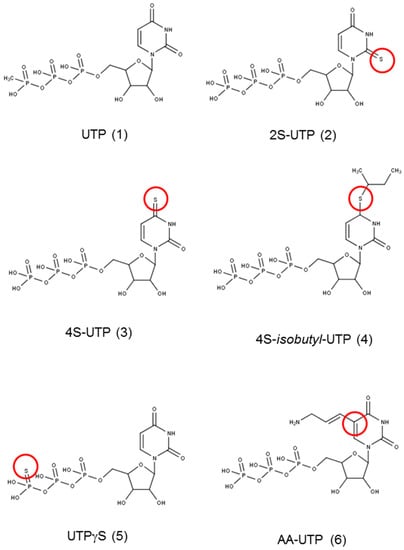 Structure of the compounds used in the study. The marked site shows the modification of the parent compound uridine triphosphate (UTP). Red circle mark the modified position in the original compound 1.