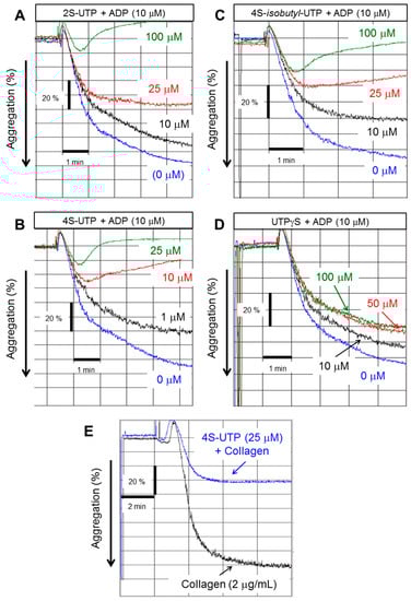 UTP thio-analogues antagonise adenosine diphosphate (ADP)-induced platelet aggregation. Representative tracing of platelet aggregation induced by ADP (10 µM) in the absence or presence of: 2S-UTP (A); 4S-UTP (B); 4S-isobutyl UTP (C); and UTPγS (D). Representative tracings from four experiments using independent PRP preparations. (E) Representative tracing of platelet aggregation induced by collagen (2 µg/mL) in the absence or presence of 4S-UTP (25 µM).