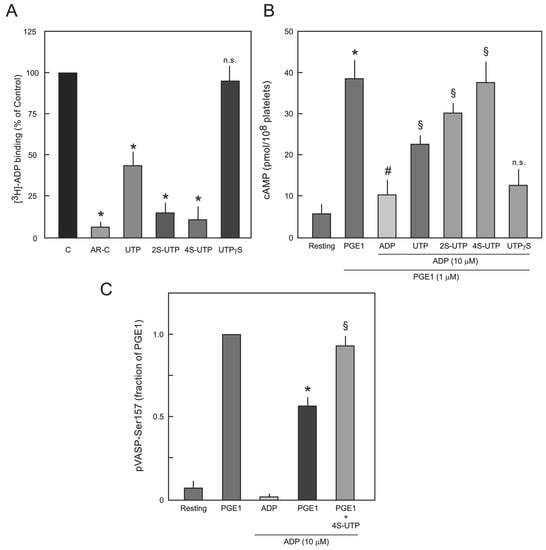 (A) Competitive binding of [3H]-ADP to platelet P2Y12 receptor. Platelets were incubated with 10 nM of [3H]-ADP in the absence (C; control) or presence of saturated concentrations (5x the respective IC50 values) of UTP, 2S-UTP, 4S-UTP, UTPγS and binding of [3H]-ADP to P2Y12 receptor was analysed as described in Section 4.4. AR-C66096 (AR-C; 10 µM; a potent P2Y12 receptor antagonist) was used as positive control. The data are means ± S.E.M of three experiments using independent platelet preparations. * p < 0.05 vs. control. n.s.: not significantly different from control; (B) Effect of UTP thio-analogues on cAMP level in PGE1- and ADP-stimulated human platelets. Different preparations of washed platelets were pre-incubated with PGE1 (1 µM) and UTP analogues (UTP 250 µM; 2S-UTP 100 µM; 4S-UTP 25 µM; and UTPγS 100 µM) for 10 min as indicated followed by stimulation with ADP (10 µM). * p < 0.05 vs. control, # p < 0.05 vs. PGE1, § p < 0.05 vs. ADP; (C) Effect of 4S-UTP on PGE1-mediated VASP phosphorylation (pVASP-Ser157) in ADP-stimulated human platelets. PRP was pre-incubated with vehicle (resting) or PGE1 (1 µM) followed by treatment with ADP (10 µM) or ADP plus 4S-UTP (25 µM) and pVASP-Ser157 was measured by flow cytometry. pVASP-Ser157 in the presence of PGE1-was taken as 1. * p < 0.05 vs. PGE1 alone, § p < 0.05 vs. PGE1 plus ADP.