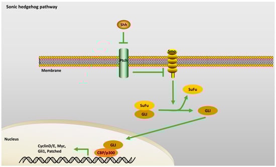 Sonic Hedgehog Pathway: Shh acts on Ptch to inhibit the repression of Smo by Ptch. GLI releases from SuFu to promote transcription of target genes upon binding to CBP/p300. Green arrow represents “activation”. Abbreviation: Shh: Sonic Hedgehog; Ptch: Patched; Smo: Smoothened; CBP: CREB binding protein; SuFu: Suppressor of Fused.