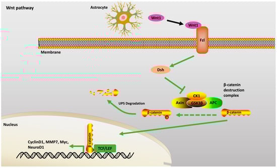 Wnt proteins are produced in the hippocampal astrocytes which govern the differentiation and proliferation of neural progenitor cells (NPCs) [17,18]. During embryogenesis, a coordinated interaction between multiple interacting partners such as β-catenin, adenomatous polyposis coli (APC), GSK-3β, Axin and Conductin is observed [19]. For successful Wnt signaling to take place, Wnt proteins interact with GSK3β and inhibit its action, thereby preventing phosphorylation of β-catenin and consequently rescuing it from UPS degradation. The buildup of cytoplasmic β-catenin translocates into the nucleus. It interacts with lymphocyte enhancing factors (LEFs) and T-cell factors (TCFs) to activate transcription of multiple target genes (Figure 2). By the orchestration of several transcriptional factors, Wnt signaling promotes the proliferation of early NPCs [20]. Many studies have shown that this signaling through Wnt stimulates neuronal and astroglial differentiation but inhibits oligodendroglial differentiation [21].
