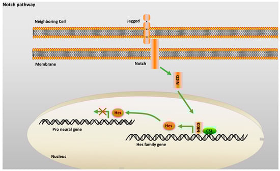 Notch is a single pass transmembrane protein largely involved in determining the fates and lineage of developing neural stem cells (NSCs) [22,23]. Notch transmembrane receptors are activated by Delta and Jagged, two other single pass transmembrane proteins, after which the intracellular portion of the membrane is cleaved by γ-secretase to release Notch intracellular domain (NICD) [24]. The released NICD translocates into the nucleus and complexes with Centromere binding factor-1 (CBF1), a transcription regulator (Figure 3). Several studies have shown that this complex activates target genes, such as Hes, Hes5 and ErbB2, which, when transcribed, aid in the proliferation and maintenance of stem cells and in inhibiting neural differentiation [25,26].