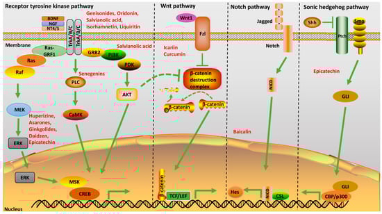 Schematic description of neurogenesis of traditional Chinese medicine (TCM). TCM active ingredients can activate neurogenic pathways such as Wnt, Notch, Shh and Neurotrophic factors. Activation of neurotrophic factors by TCMs can activate three major pathways downstream of Trk receptors, namely MAPK/ERK, PLC and PDK. The active effector molecules translocate into the nucleus and activate genes necessary for neurogenesis. Dashed line and dashed arrow: inhibition. Green arrow: activation. Abbreviation: MAPK: mitogen-activated protein kinase; MEK: MAPK/ERK Kinase; ERK: Extracellular signal-regulated kinase; CREB: cAMP response element-binding protein; MSK: Mitogen and stress activated kinase; PKC: Protein kinase C; PI3K: phosphotidyl inositol-3 kinase; RasGRF1: Ras Protein Specific Guanine Nucleotide Releasing Factor 1.