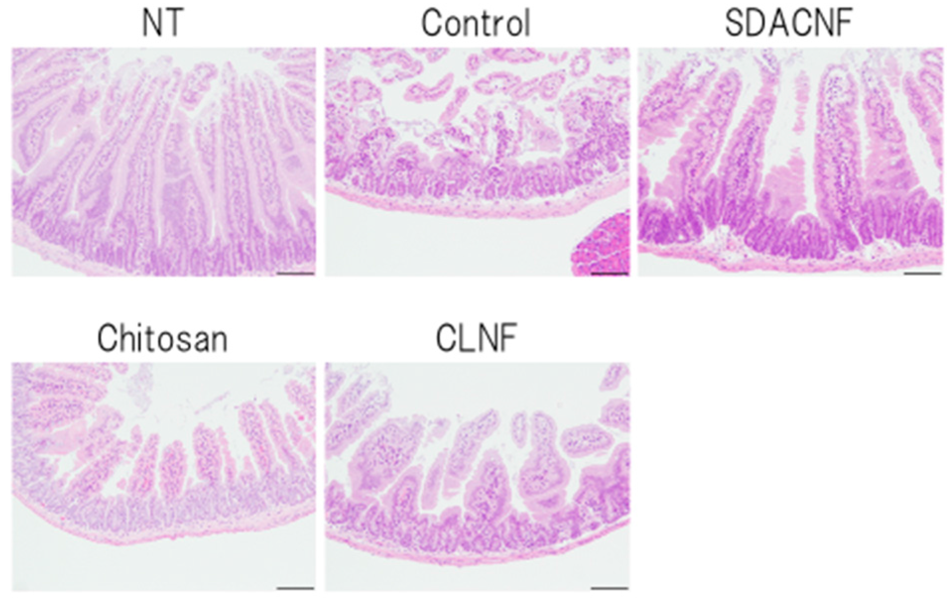 Low-magnification images and scanning electron micrographs of SDACNF and chitosan are shown in Figure 1. Chitosan was dissolved in 0.5% acetic acid, whereas SDACNF was a gel that formed a nanofiber network. The study design is shown schematically in Figure 2. There were no differences in small intestine length and weight-to-length ratio among control, SDACNF, chitosan, and cellulose nanofiber (CLNF) groups (data not shown). In the latter two groups, mucosal architecture, ulceration of the mucosa, reduction in villus height, and inflammatory cell infiltration (MI) were observed by hematoxylin and eosin (H&E) staining (Figure 3). However, these were not detected in the chitosan and SDACNF groups.