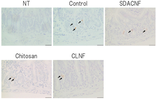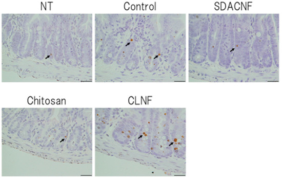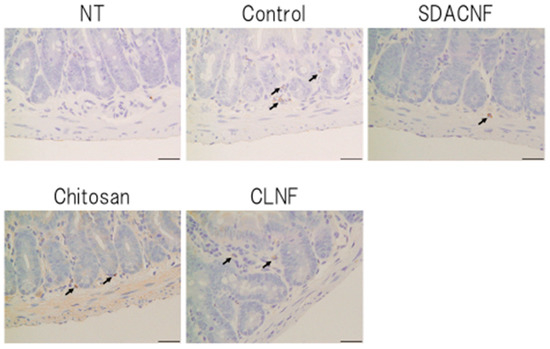 Immunohistochemical analysis of caspase-3 expression. Images were obtained from one of three mice per group. Arrows indicate caspase-3-positive cells. High magnification images are shown. Bar: 50 μm. NT: No treatment; Control: control group; SDACNF: surface deacetylated chitin nanofiber group; Chitosan: chitosan group; CLNF: cellulose nanofiber group.