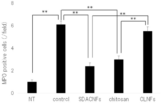 Number of MPO-positive cells. Data represent mean ± S.E. Means were compared with the Steel–Dwas test. ** p < 0.01. MPO-positive cells were counted under the microscope in 10 randomly selected high-power fields (200× magnification) per cross section. The jejunum of three mice per group were analyzed. The mean number of MPO-positive cells in 30 fields was determined for each group. NT: No treatment; Control: control group; SDACNF: surface deacetylated chitin nanofiber group; Chitosan: chitosan group; CLNF: cellulose nanofiber group.