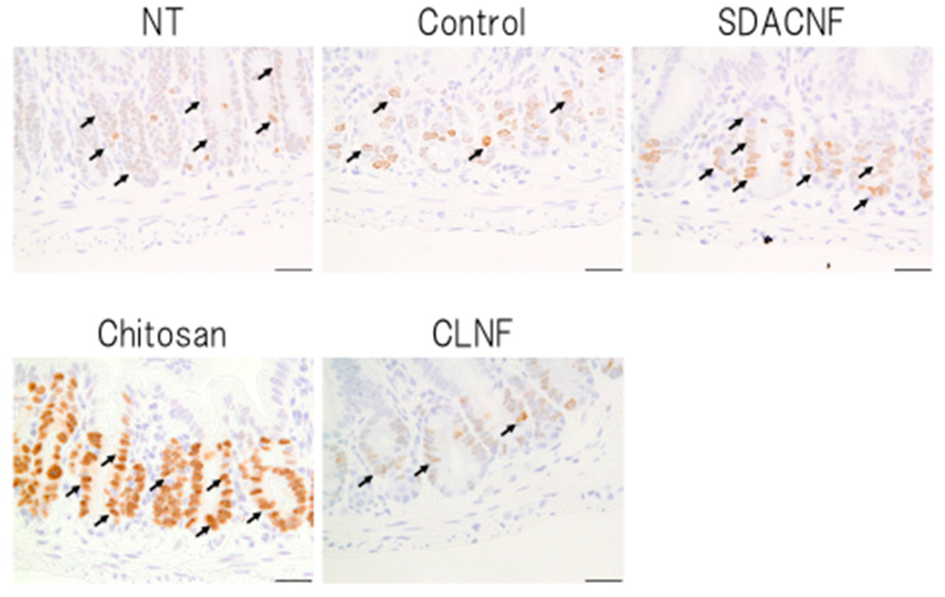 Although the pathogenic mechanism of intestinal mucositis induced by anti-cancer drugs is not well understood, it is thought to be a consequence of various processes such as apoptosis and abnormal inflammation in the intestinal mucosa as well hypoproliferation of intestinal crypt cells [20,21,22]. Ki-67 is a marker of proliferating cells that is expressed during all active phases of the cell cycle [23]. Our results indicate that oral administration of SDACNF and chitosan suppresses the crypt cell hypoproliferation induced by 5-FU.