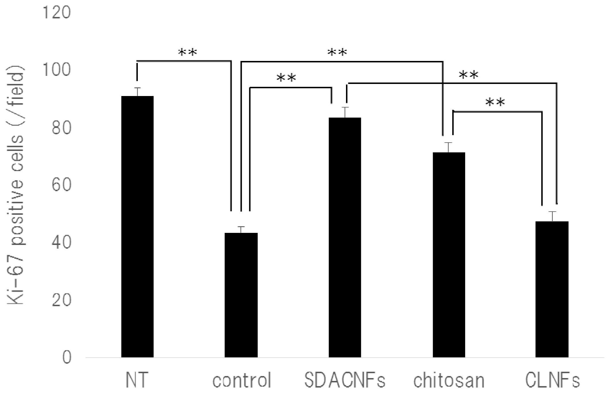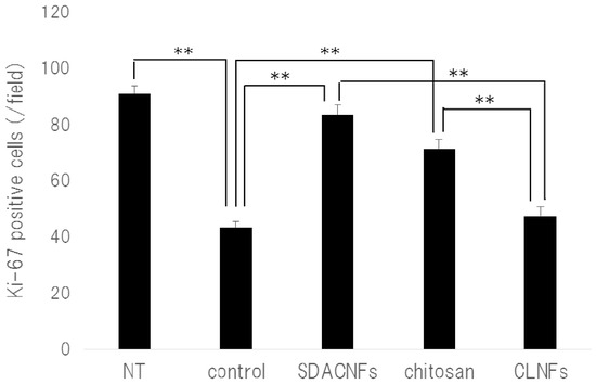 Number of Ki-67 positive cells. Data are expressed mean ± S.E. Means were compared with the Steel–Dwas test. ** p < 0.01. Ki-67 positive cells were counted under the microscope in 10 randomly selected high-power fields (200× magnification) per cross section. The jejunum of three mice per group were analyzed. The mean number of Ki-67-positive cells in 30 fields was determined for each group. NT: No treatment; Control: control group; SDACNF: surface deacetylated chitin nanofiber group; Chitosan: chitosan group; CLNF: cellulose nanofiber group.