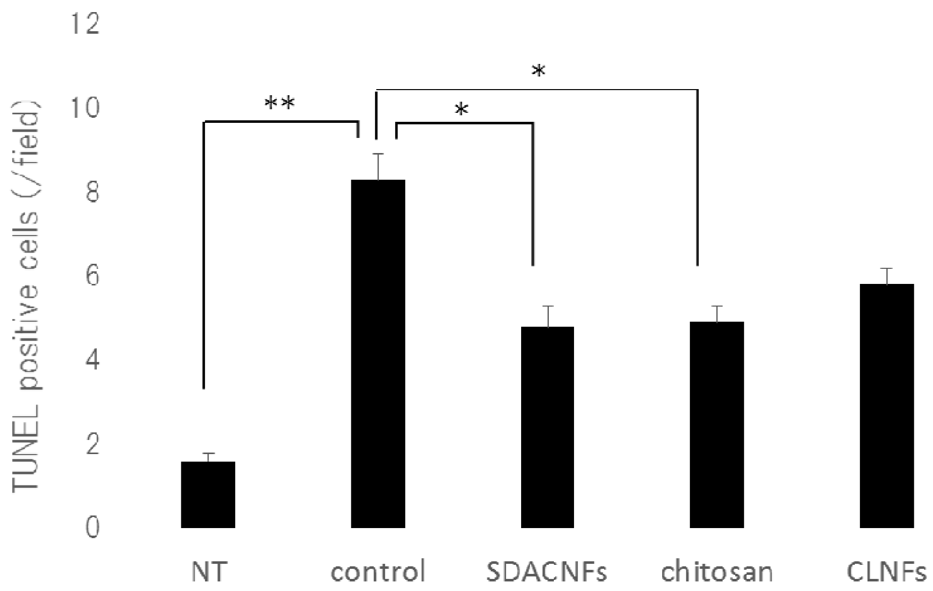 Number of TUNEL positive cells. Data represent mean ± S.E. Means were compared with the Steel–Dwas test. * p < 0.05, ** p < 0.01. TUNEL-positive cells were counted under the microscope in 10 randomly selected high-power fields (200× magnification) per cross section. The jejunum of three mice per group were analyzed. The mean number of TUNEL-positive cells in 30 fields was determined for each group. NT: No treatment; Control: control group; SDACNF: surface deacetylated chitin nanofiber group; Chitosan: chitosan group; CLNF: cellulose nanofiber group.
