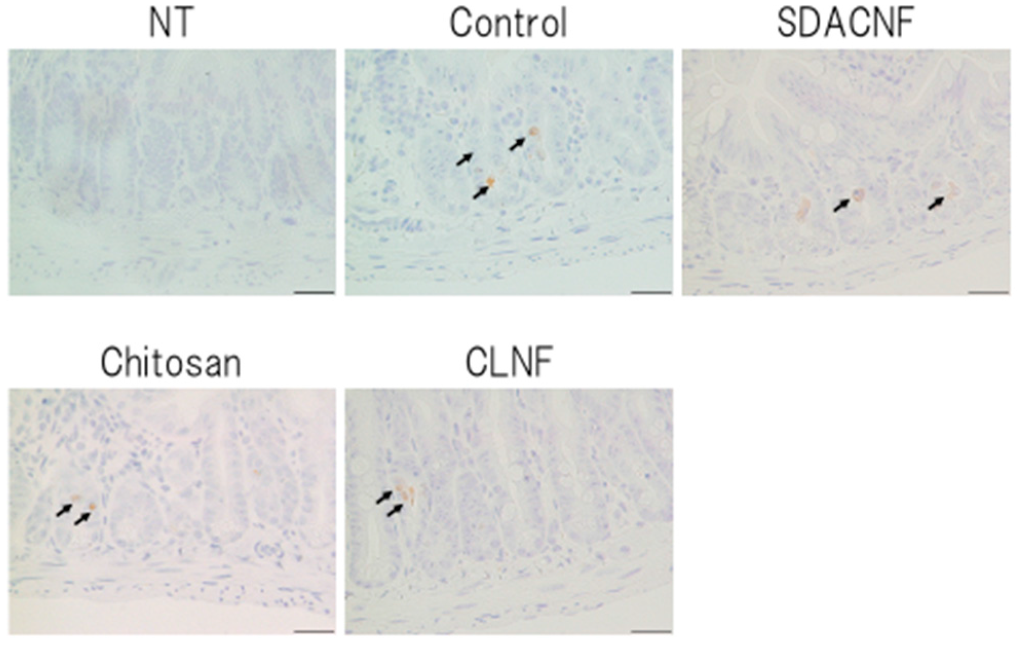 Apoptosis is an important consequence of intestinal mucositis induced by anti-cancer drugs such as 5-FU [24,25,26,27]; indeed, we observed an increase in the number of TUNEL- and caspase-3-positive apoptotic cells in the intestinal crypt of control mice, which was abolished in the SDACNF and chitosan groups. Caspase-3 is the main downstream effector in apoptosis [28,29], whose activity was shown to be increased during intestinal cell apoptosis induced by chemotherapy, including 5-FU treatment [30,31,32]. Our results indicate that oral administration of SDACNF and chitosan suppressed apoptosis in the intestinal crypt by inhibiting caspase-3 activity. Although the suppression of apoptosis by chitosan has been previously demonstrated [33], ours is the first report describing the anti-apoptotic effects of orally administered chitosan in intestinal mucositis. The effectiveness of chitosan-derived gel has been previously described [34]. However, its mechanism of action is unknown. We have demonstrated that SDACNFs have similar bioactivity [14,15], and the results of the present study indicate that SDACNFs are equally or more effective than chitosan in preventing intestinal mucositis. However, the mode of absorption and metabolites of SDACNFs remain unknown and require clarification in future studies.