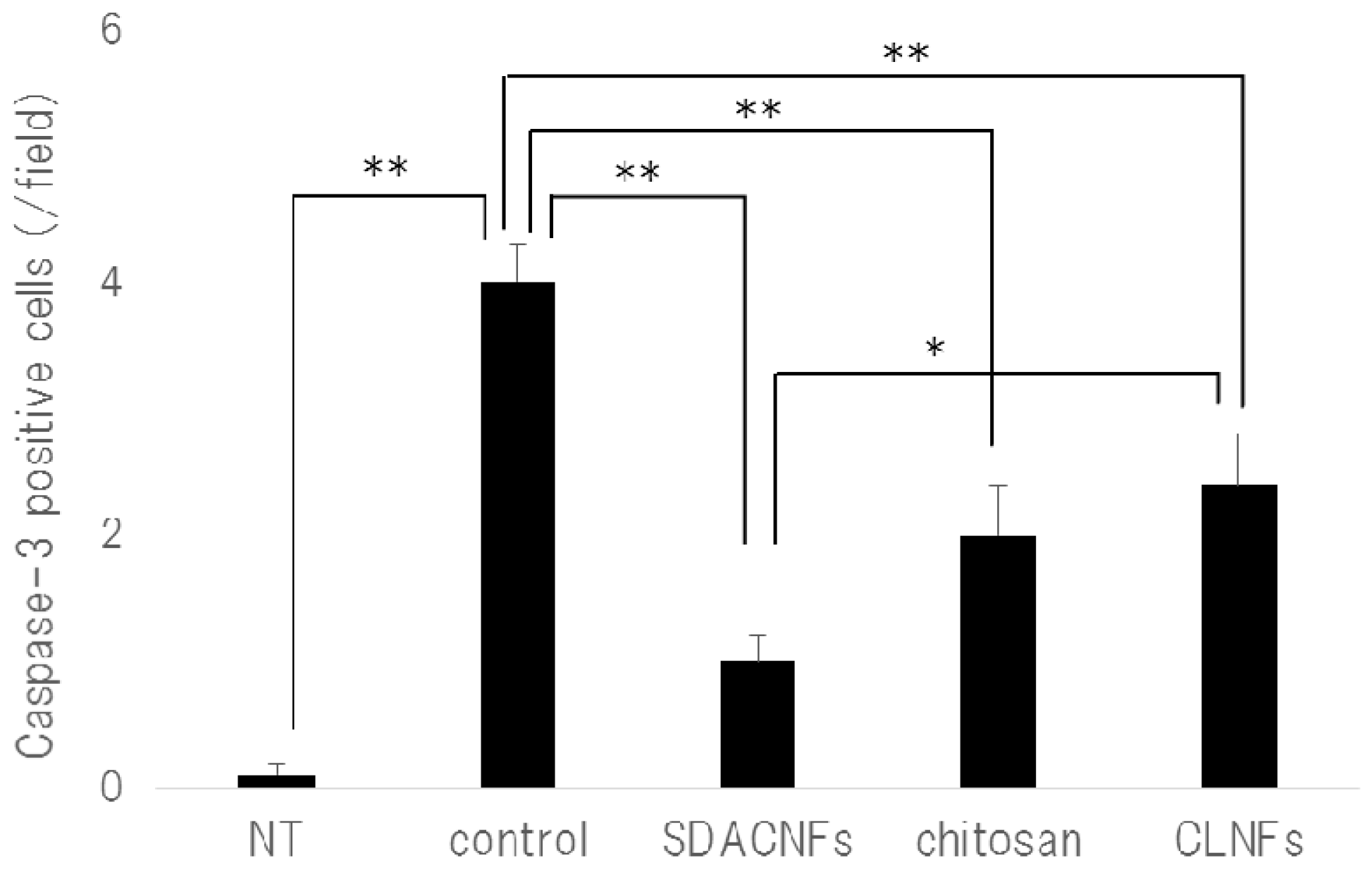 Number of caspase-3 positive cells. Data represent mean ± S.E. Means were compared with the Steel–Dwas test. * p < 0.05, ** p < 0.01. Caspase-3-positive cells were counted under the microscope in 10 randomly selected high-power fields (200× magnification) per cross section. The jejunum of three mice per group were analyzed. The mean number of caspase-3 positive cells in 30 fields was determined for each group. NT: No treatment; Control: control group; SDACNF: surface deacetylated chitin nanofiber group; Chitosan: chitosan group; CLNF: cellulose nanofiber group.