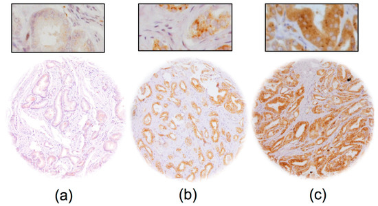 Normal prostate glands showed absent to low cytoplasmic staining in luminal cells under the selected experimental conditions. GGH staining was detectable in 9322 of our 10,562 (88.3%) interpretable prostate cancers, and was considered as “low intensity” in 49.6% and as “high intensity” in 38.6% of cancers. Representative images of GGH staining are given in Figure 1.