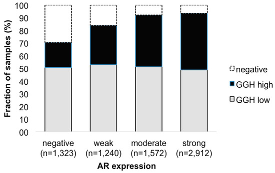 Androgen receptor (AR) expression was strongly linked to GGH staining (Figure 3). High-level GGH expression was found in 19.9% of cancers without detectable AR expression, but in 44.6% of tumors with strong AR expression (p < 0.0001, each).