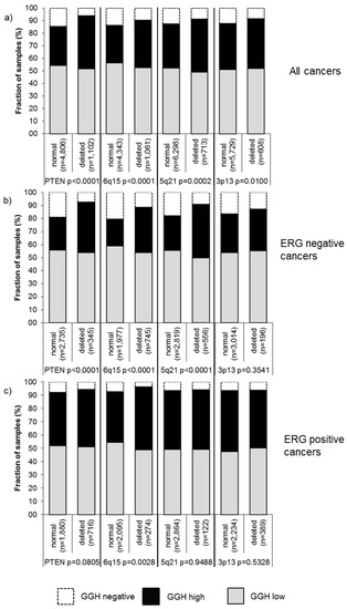 Earlier studies have provided evidence for distinct molecular subgroups of prostate cancers defined by TMPRSS2:ERG fusions and several genomic deletions. Others, as well as ourselves, have previously described a strong link of PTEN and 3p13 deletions to ERG positivity and of 5q21 and 6q15 deletions to ERG negativity [17,18,19,20]. To study whether GGH expression might be particularly associated with one of these genomic deletions, GGH data were compared to pre-existing findings on 10q23 (PTEN), 3p13 (FOXP1), 6q15 (MAP3K7), and 5q21 (CHD1) deletion. If all cancers were jointly analyzed, GGH expression was significantly linked to all deletions (PTEN (p < 0.0001), 3p13 (p = 0.0100), 5q21 (p = 0.0002), 6q15 (p < 0.0001); Figure 4a). Subgroup analysis of ERG-negative and ERG-positive cancers revealed that these associations were merely driven by the subset of ERG-negative cancers (Figure 4b), while there was no unequivocal impact of GGH levels on the deletion status in ERG-positive cancers (Figure 4c).