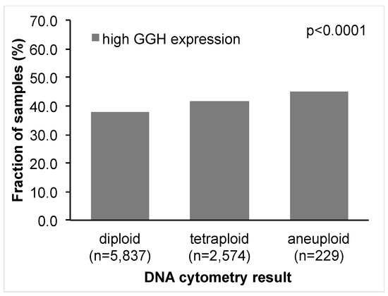 GGH expression was significantly associated with DNA ploidy status (p < 0.0001, Figure 5). High GGH expression was seen in 2212 of 5837 (38%) patients with diploid DNA status, in 42% of patients with tetraploid DNA status, and in 45% of patients with aneuploid DNA status.