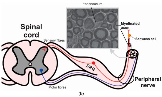 Peripheral nerves are elaborate organs, composed of nervous tissue, connective stroma and a complex vascular network []. Most peripheral nerves contain both sensory (afferent) and motor (efferent) axons with variable axon diameter from 1 µm (unmyelinated pain-sensing neurons) to 20 μm (large, myelinated motor axons) []. The cell bodies of peripheral motor neurons and sensory neurons are localised in the anterior horn of the spinal cord and dorsal root ganglia (DRG), respectively (Figure 1b). Peripheral axons and their associated SCs are surrounded and supported by a stratification of connective tissue architecture []. The innermost layer surrounding each individual axon is the endoneurium (Figure 1b), which contains endoneurial extracellular matrix (ECM) consisting predominately of collagen bundles, providing an important protective channel for the axon. Although endoneurial fibroblasts secrete ECM proteins into the endoneurial tube [], SCs are the chief orchestrator in synthetizing collagen for both the endoneurium and perineurium []. The ECM contains insoluble components (collagen, fibronectin, and laminin) that provide mechanical support for the axon and physically prevents conduction interference between adjacent axons []. Groups of endoneurial tubes are formed into larger fascicles named the perineurium; a mechanically strong sheath enclosed by a basal lamina and interspersed by longitudinal collagen fibres []. The epineurium is the outermost loose connective tissue layer, consisting of a more sparse arrangement of collagen fibres and adipose tissue, which encapsulate the perineurial bundles and nutritive blood vessels to form a single nerve.