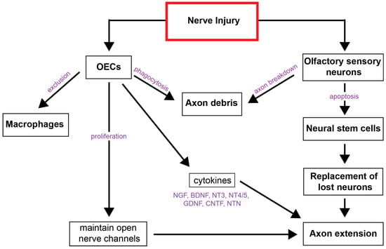 Axonal debris is continuously being generated in the intact olfactory nerve due to the constant regeneration of olfactory sensory neurons. Macrophages are largely absent from this nerve, and are not in direct contact with axon fascicles. Instead, it is OECs that continuously clear the debris []. As discussed earlier, OECs have been identified as the primary innate immunocyte of the olfactory nervous system []. Even after olfactory nerve injury, OECs are the main cells responsible for debris clearance, and macrophage recruitment to the area is very limited [].