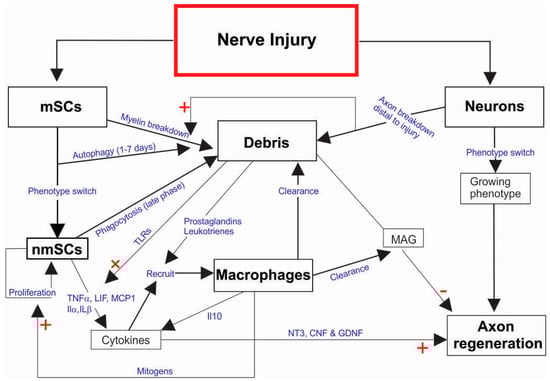 Overview of Schwann cell response to peripheral nerve injury. (Arrows connect sequential events; + denotes a positive response; − denotes a negative or inhibitory response; mSCs, myelinating Schwann cells; nmSCs, non-myelinating Schwann cells; MAG, myelin associated protein; TLRs, toll-like receptors; CNF, cytotoxic necrotizing factor; TNF, tumor necrosis factor; LIF, leukemia inhibitory factor; MCP1, monocyte chemoattractant protein-1; IL, interleukins).