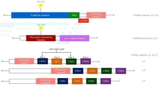 Diagram of the adenosine monophosphate-activated protein kinase (AMPK) domain structure. Two α subunits, two β and three γ subunits have been described to date. The α-subunit is conformed by a catalytic domain containing Thr172 kinase for the activation by upstream kinases, Liver Kinase B1 (LKB1) and Ca2+/calmodulin-dependent protein kinase kinase-β (CaMKKb), an auto-inhibitory domain (AID), two regulatory interacting motifs (α-RIMs), and a C-terminal domain that firmly binds to β and γ subunits. The β-subunit contains a N-terminal domain rich in glycine, a carbohydrate binding module (CBM) containing Ser108, important for some direct activators of AMPK, and a C-terminal domain that attaches to α and γ subunits. The γ-subunit consist of three γ isoforms and variable length N-terminal domains and four cystathionine β-synthase domains (CBS) forming bateman domains that create adenosine monophosphate (AMP)/ adenosine diphosphate (ADP)/adenosine triphosphate (ATP) binding sites. All amino acid numbers refer to human AMPK sequences.