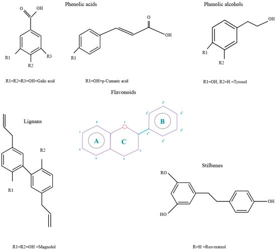 Polyphenols are phytochemical compounds that constitute an important part of human diet. Many different nutraceuticals belonging to this group have been identified in a wide variety of fruits, vegetables and other plant-based foods, such as grains or roots [13]. Chemically, polyphenols contain one or more benzene rings joined to hydroxyl groups that confer the molecule the so-called antioxidant capacity. Based on differences in generic structure of the aromatic rings and the chemical groups attached to them, polyphenols are classified into five different subclasses (Figure 3): flavonoids, phenolic acids (derived from hydroxybenzoic acid or hydroxycinnamic acid), phenolic alcohols, stilbenes and lignans [14]. Flavonoids are the widest group of polyphenols, which in turn, are classified into another five different subgroups: isoflavones, flavonols, anthocyanins, flavones and flavonones [13], quercetin being the best example to explain flavonoids actions concerning to its molecular structure (Figure 4).