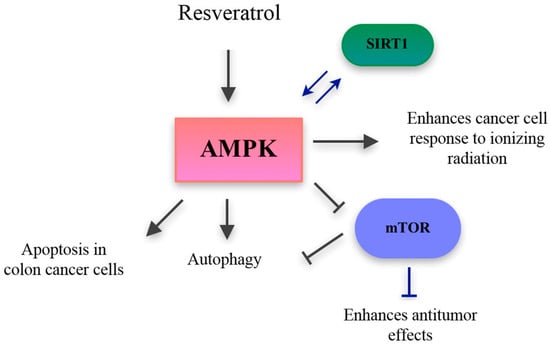 Targeting the AMPK activation through nutraceuticals. Resveratrol activates AMPK leading to apoptosis of colon cancer cells, enhance of cancer cell response to ionizing radiation, and mTOR-dependent and independent autophagy. Resveratrol also activates SIRT1, which improves AMPK activation, leading in turn to downregulation of mTOR. mTOR: mammalian target of rapamycin, SIRT1: Sirtuin-1. Grey and blue arrows indicate activation, T-bars indicate downregulation.