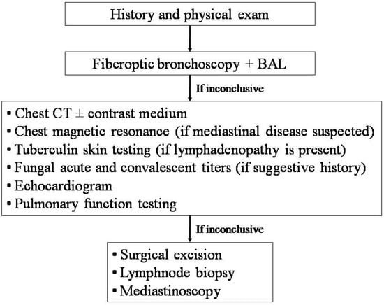 During bronchoscopy, samples from airways or alveolar spaces should be obtained for culture and cytologic examination. HRCT should be performed when the child has no acute infection, in order to avoid issues in the interpretation of the scans. If possible, this should be compared with previous imaging to check whether the anomaly is new. Administration of an intravenous medium should be considered, in order to obtain a detailed picture of the vascular anatomy at CT. A congenital pulmonary malformation is likely if the abnormality drains into the systemic circulation or has an arterial supply from the aorta. If mediastinum or chest wall disease is suspected, or in cases presenting with soft-tissue masses, chest magnetic resonance is extremely effective [43]. The lack of radiation exposure makes this imaging technique very attractive, and therefore it has also been introduced in clinical practice for obtaining anatomical and functional information on children with recurrent or chronic lung disease [44,45,46]. Unfortunately, the need for general anesthesia in young children might represent a limitation to its use, unless essential [46]. Tuberculin skin testing, and acute and convalescent titers for coccidioidomycosis, blastomycosis, and histoplasmosis, should be performed if specific pointers are present [33]. An echocardiogram is essential for investigating an enlarged cardiac chamber which is compressing the bronchus.