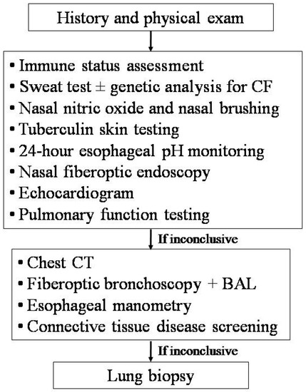 Ideally, the diagnosis should be confirmed or excluded with the minimum possible number of the least-invasive confirmatory tests. Patients should undergo a blood test to assess their immune status (i.e., blood cell counts, serum immunoglobulins, total IgE, IgG sub-classes, lymphocyte sub-populations, C3, C4, CH50, and specific antibody responses to tetanus toxoid, capsular polysaccharides of Haemophilus influenzae type B, Streptococcus pneumoniae, and/or measles, rubella, mumps, and hepatitis B viruses), nasal fiberoptic endoscopy, sweat test and/or genetic analysis for CF, 24-h esophageal pH monitoring, tuberculosis screening, nasal nitric oxide measurement, and ciliary motility/ultrastucture study [13,14,53]. Some children with RP have normal levels of IgG, but low levels of IgG subclasses. Indeed, IgG2 subclass deficiency is associated with poor antibody responses to polysaccharides. If all of these investigations are negative but RP persists, bronchoscopy with bronchoalveolar lavage (BAL) is recommended, in order to identify potentially untreated pathogens, perform a cytologic examination, and assess the lipid burden in alveolar macrophages (an indirect sign of pulmonary aspiration) [14]. However, the use of lipid-laden macrophages measured on BAL lacks specificity [54]. Therefore, if lipid-laden macrophages are not found in the BAL, significant aspiration is unlikely. The assessment of BAL pepsin has a higher specificity [55], but this test can only be performed in a few centers. A tube esophagram is the usual investigation performed if late-presenting congenital H-type fistula is suspected, but a normal test does not exclude this diagnosis, and direct visualization with bronchoscopy may be needed [36,56]. Sophisticated manometry should be considered if esophageal dysmotility defects are suspected. A pulmonary hemorrhage can be diagnosed in the presence of iron-laden macrophages at BAL. However, this test can not discriminate among the different causes of bleeding. If there is no evidence of an underlying predisposing disease, the condition is usually considered to be idiopathic pulmonary hemosiderosis, and a confirmatory lung biopsy is not required [36]. However, an open lung biopsy should be considered in the presence of recurrent bleeding, in order to exclude neutrophilic capillaritis [57]. If a connective tissue disease is suspected, screening tests include the erythrocyte sedimentation rate, circulating immune complexes, complement studies, rheumatoid factor, anti-neutrophil cytoplasmic antibodies, double-stranded DNA, and anti-glomerular basement membrane antibody (for children with pulmonary hemorrhage and renal disease).