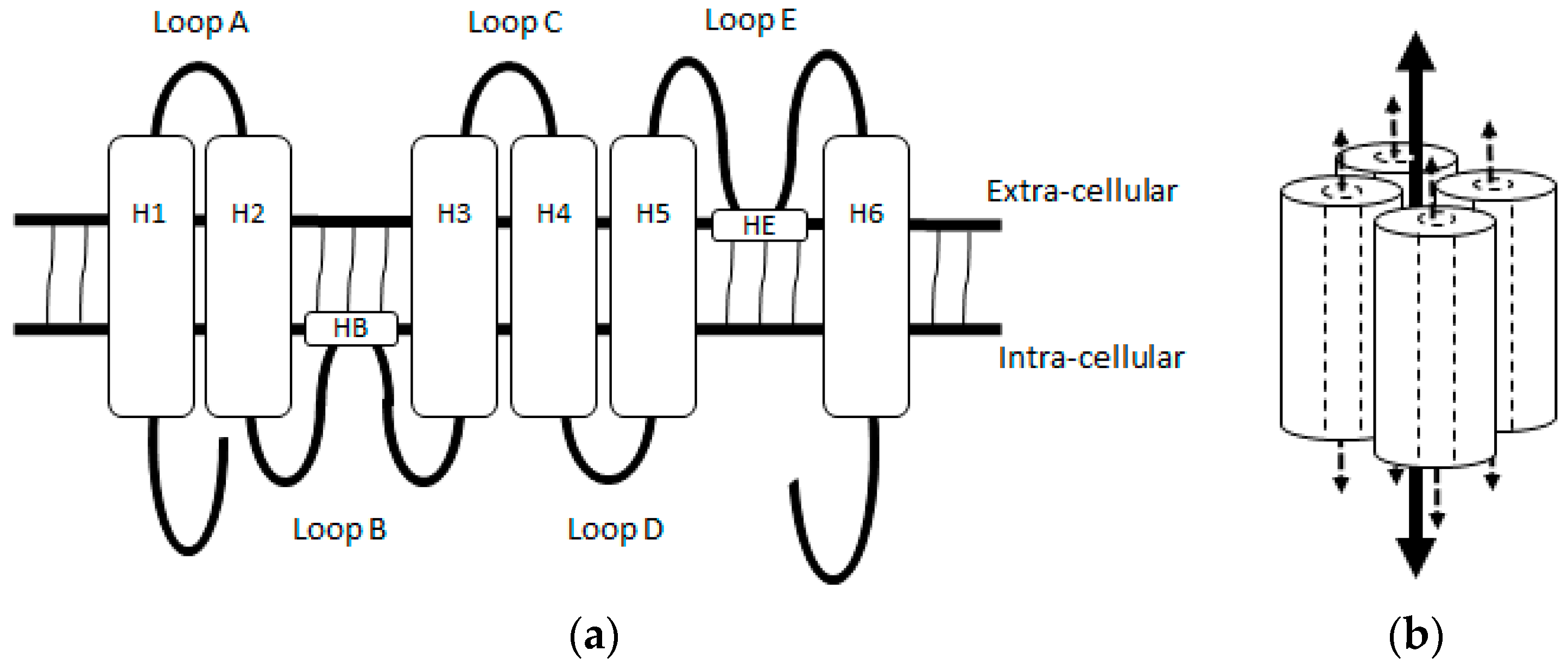 - Verkman, A.S.; Anderson, M.O.; Papadopoulos, M.C. Aquaporins: Important but elusive drug targets. Nat. Rev. Drug Discov. 2014, 13, 259–277. [Google Scholar] [CrossRef] [PubMed]