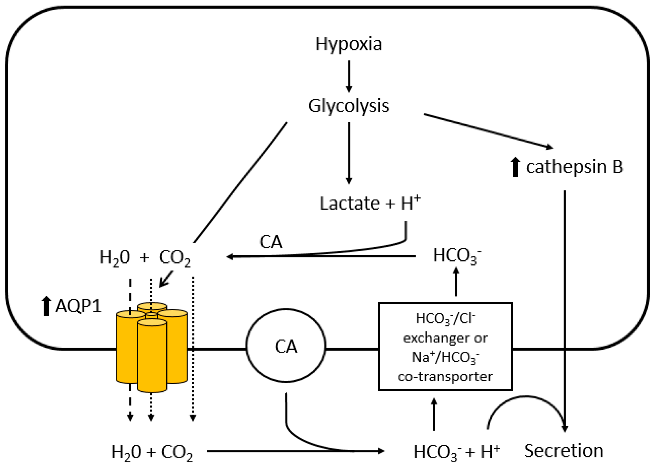 Putative mechanism of hypoxia-facilitated AQP1 expression in tumour cells. Hayashi and colleagues postulated that hypoxia facilitates AQP1 expression through glycolysis [72]. Hypoxia-induced glycolysis produces lactic acid and enhances the transcription of AQP1 and cathepsin B through E-box/ChoRE. The elevated lactic acid causes intracellular acidosis and an excess in H+. The excess H+ are converted to H2O and CO2 through the reaction with HCO3− which is catalyzed by intracellular carbonic anhydrases (CA). The excess H2O generated exits the tumour cell through the water pores of the up-regulated AQP1 (dashed line - -) to prevent cytotoxic oedema, while CO2 may leave the cell through the central pore of the AQP1 tetramer or diffuse through the plasma membrane (dotted line ·····). The H2O released from the cell is recycled to regenerate H+ by membrane-bound CA with resultant acidification of the extracellular compartment, stimulating production and secretion of cathepsin B.