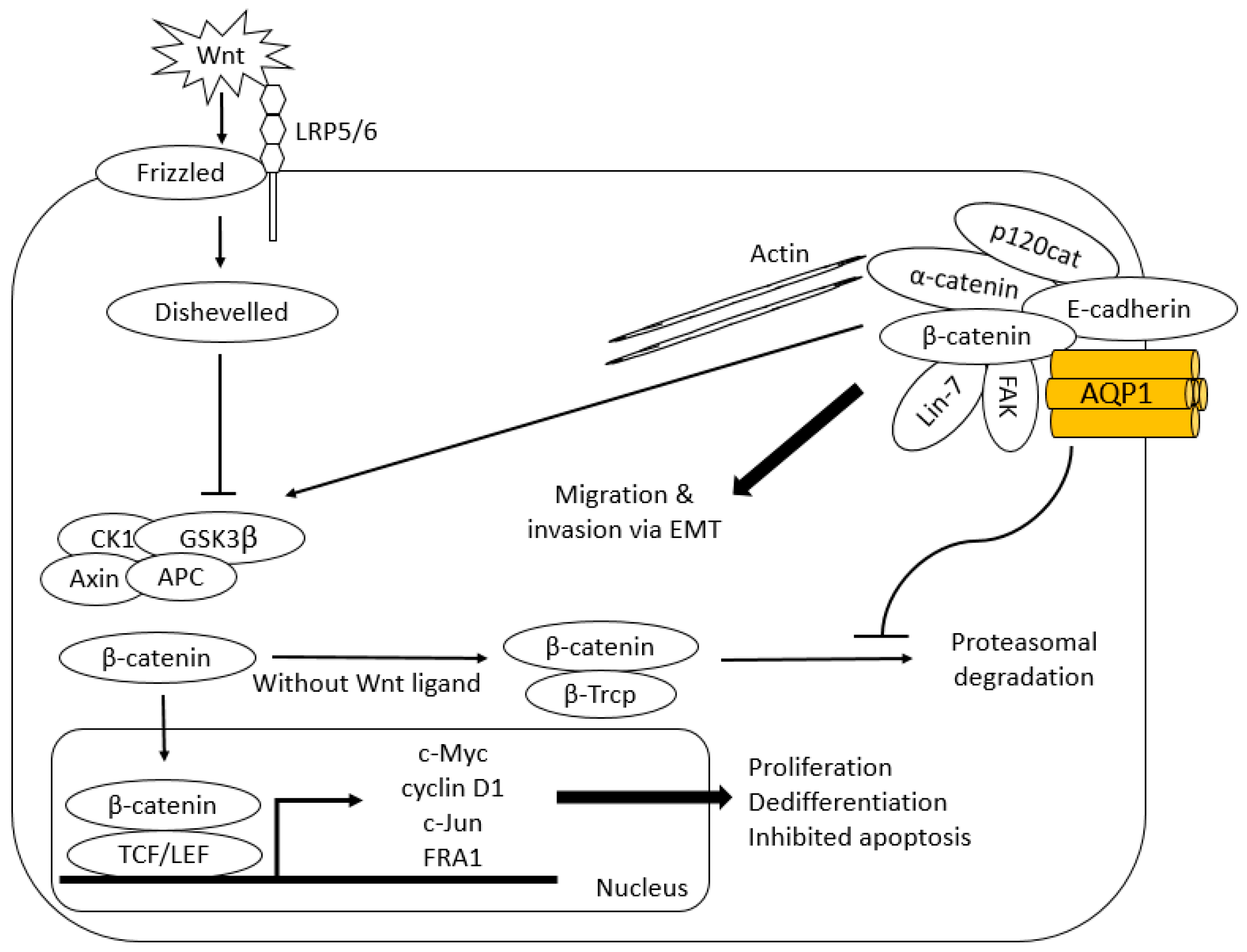 Meng and colleagues demonstrated co-immunoprecipitation of AQP1 and β-catenin with up-regulation of β-catenin when mesenchymal stem cells (MSC) were made to over-express AQP1 [91]. β-catenin functions as an intracellular signal transducer in canonical Wnt signalling pathway and regulates gene transcription (Figure 3) [92,93]. In the absence of Wnt ligand, cytoplasmic β-catenin forms a complex with Axin, APC, GSK3β and CK1 and becomes phosphorylated. This allows β-catenin to be recognized by E3 ubiquitin ligase β-Trcp for proteasomal degradation. In the presence of Wnt ligand, a receptor complex forms between Frizzled and LRP5/6 resulting in recruitment of Dishevelled, which phosphorylates LRP5/6 with subsequent Axin recruitment. This disrupts Axin-mediated phosphorylation/degradation of β-catenin, allowing β-catenin to transport to the nucleus where it serves as a co-activator for TCF to activate Wnt responsive genes including those responsible for tumorigenesis such as c-Myc, cyclin D1, c-Jun and FRA1.
