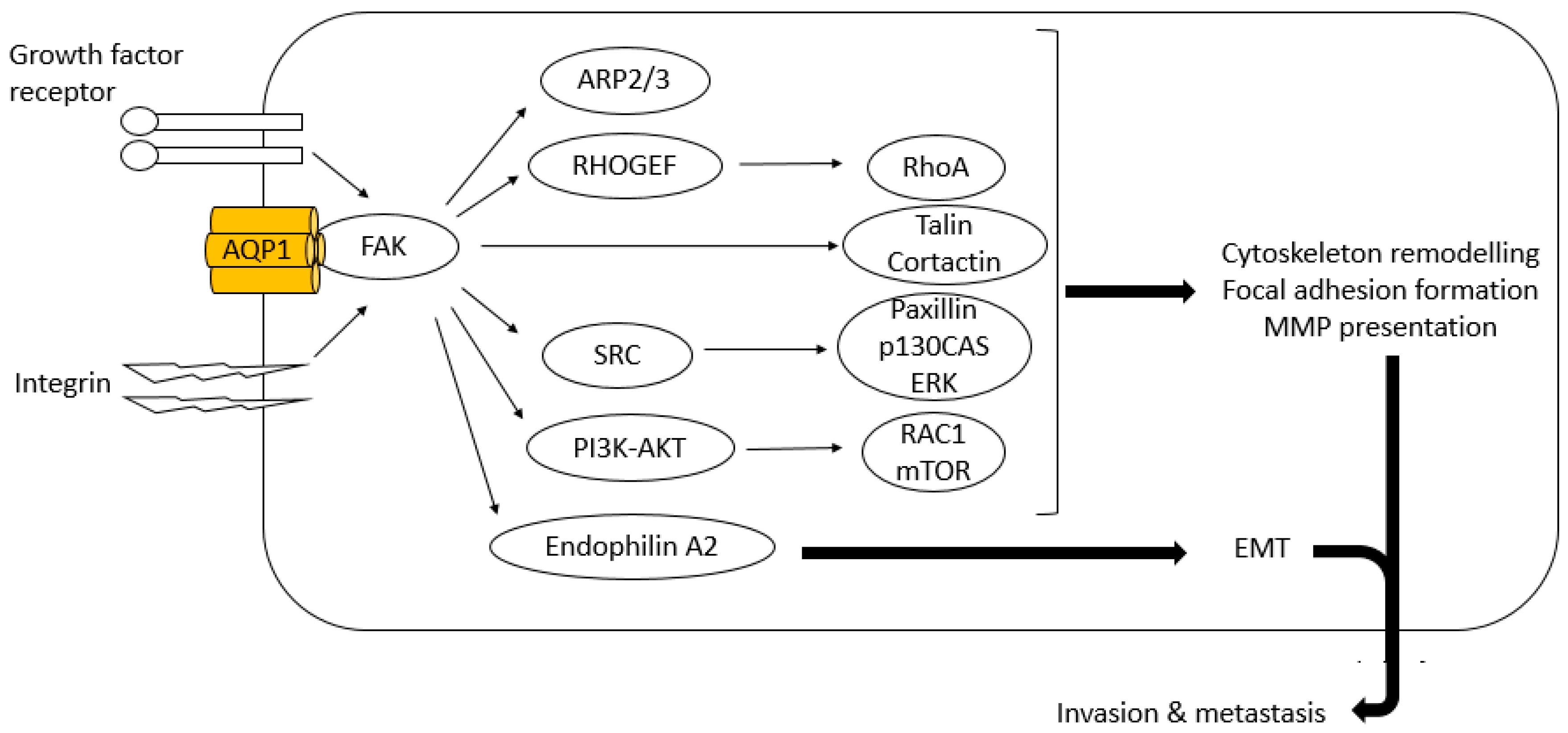 Despite the extensive literature supporting the involvement of AQP1 in cancer development and progression, the exact signalling pathways involved are yet to be elucidated. Several molecules and intracellular pathways have been implicated in AQP1 downstream signalling.