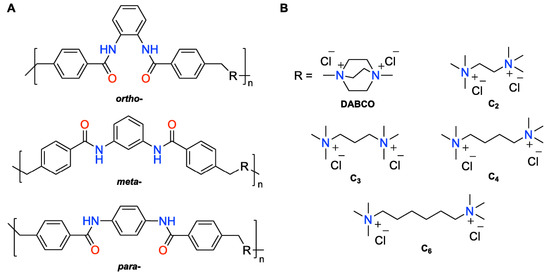 (A) General structures of ionene polymers used in this study and (B) charged diammonium moieties with different structures and chain length. The combinations investigated in this work were o-DABCO, o-C2, o-C3, o-C6, m-DABCO, m-C2, m-C3, m-C4, m-C6, p-DABCO, p-C2, p-C3 and p-C4. Note: o- = ortho-; m- = meta-; p- = para-.