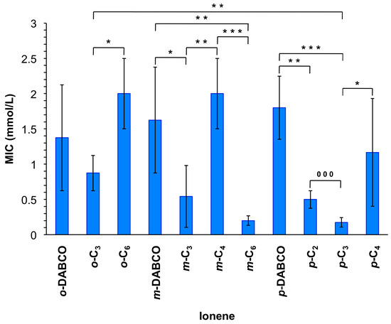 Minimum inhibitory concentrations (MIC) of ionene suspensions for inhibition of bacterial growth. Each value represents the mean of MIC from at least three replicates with standard deviation (SD) and analysis of variances (ANOVA) with Bonferroni comparison or unpaired t-test. * Indicates p < 0.05; ** indicates p < 0.01; ***/000 indicates p < 0.001. Note: The reported average molarities include, in some cases, chains with a variable number of cationic groups (vide infra). For the MIC values expressed in µg/mL see Figure S17.