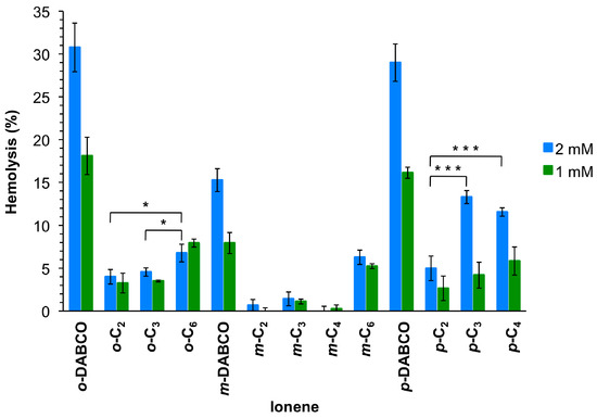 Mean values of hemolysis from at least three replicates with SD and ANOVA with Bonferroni comparison. For the sake of clarity, only comparisons within one topomeric set (ortho-, meta-, para-) at 2 mmol/L are shown in this plot. All DABCO-containing compounds showed higher hemolysis (***, omitted for clarity) in comparison to their set members. * Indicates p < 0.05; *** indicates p < 0.001. See Supplementary Material for additional comparisons (Figures S19 and S20).