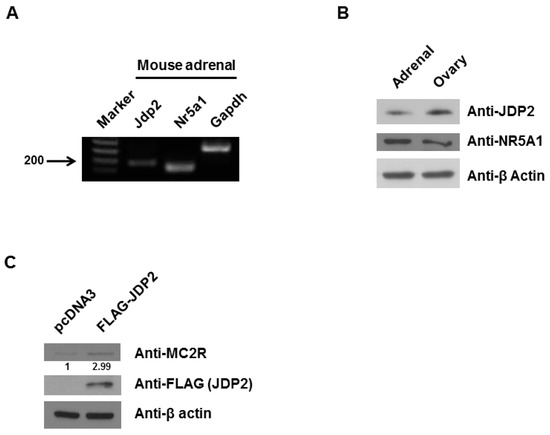 JDP2 is expressed in adrenal glands and increases melanocortin 2 receptor (MC2R) level. (A) RT-PCR analysis of Jdp2 and Nr5a1 expression from mouse adrenal glands. Total RNA was extracted and reverse transcribed to cDNA followed by PCR analysis and fractionation using agarose gel electrophoresis. The PCR product of Jdp2 (189-bp) and the PCR product of Nr5a1 (147-bp) are present in the adrenal glands. The PCR product of Glyceraldehyde-3-phosphate dehydrogenase (Gapdh) served as a control to indicate the presence of cDNA in each sample; (B) Western blot analysis of JDP2 and NR5A1 expression from mouse adrenal glands and ovaries. The expression levels of JDP2 and NR5A1 in adrenals and ovaries were determined using anti-JDP2 and anti-NR5A1 immunoblotting, respectively. The β-Actin levels were also determined for equal loading; (C) Y1 cells were transfected without or with FLAG-Jdp2 expression plasmid and cell lysates were immunoblotted with anti-MC2R. The cells lysates were probed with a FLAG antibody (for JDP2 level) and a β-Actin antibody for equal loading, respectively. The experiments were performed three times.
