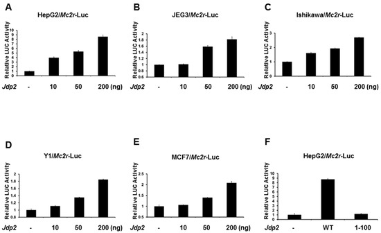 JDP2 activates Mc2r transcription. HepG2 (A), JEG3 (B), Ishikawa (C), Y1 (D), and MCF7 (E) cells were co-transfected with Mc2r-Luc and different amount of Jdp2 plasmid; (F) HepG2 cells were co-transfected with Mc2r-Luc and either wild-type or 1-100 (loss of DNA binding domain) of Jdp2 plasmid. Forty-eight hours after transfection, luciferase activities (LUC) were measured and normalized with Renilla activity. Relative LUC activity (presented as fold activation) was calculated and plotted on a graph. The experiments were conducted three times in triplicate setting. Error bars indicate the standard error. WT: Wild-type.
