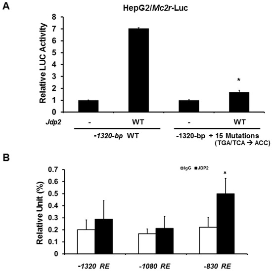 To further determine whether the cAMP response elements are required for JDP2-mediated activation, we next generated 15 cAMP response element mutations (TGA or TCA were mutated to ACC) in −1320-bp Mc2r promoter-LUC plasmids. Consistent with the previous results, mutations of 15 cAMP response elements dramatically reduced (approximately 90% loss) JDP-mediated Mc2r promoter activity in HepG2 cells (Figure 4A). Similar results were observed in JEG3 cells (data not shown). To confirm JDP2 binds to Mc2r promoter region and because the promoter region between−1320 and −720-bp is the most important region for JDP2 binding, we next performed immunoglobin G (IgG) or JDP2 chromatin immunoprecipitation (ChIP) assay with qPCR analysis. As shown in Figure 4B, JDP2 binds to −830 cAMP response element predominately. Thus, cAMP response elements are indeed required for JDP-mediated transcriptional activation.