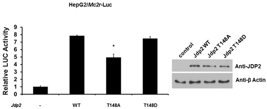 Because JDP2 has been shown to be phosphorylated at T148 by JNK (c-Jun N-terminal kinase) and p38 kinase [23], we next examined the effect of phosphorylation of JDP2 on transcriptional activity of Mc2r promoter. We cotransfected Mc2r-LUC reporter gene with either wild-type, T148A (mimicking de-phosphorylated), or T148D (mimicking phosphorylated) Jdp2 expression plasmid and determined LUC activity 48 h post-transfection. As shown in Figure 5, while wild-type and T148D JDP2 enhanced Mc2r promoter activity eight-fold, T148A JDP2 significantly reduced this effect (approximately 38% loss). This result suggests that phosphorylation of JDP2 at T148 is required for full JDP2-mediated Mc2r promoter activity.