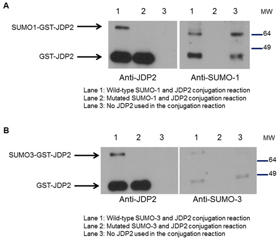 JDP2 is a novel substrate for SUMOylation. (A) In vitro SUMOylation of JDP2 with SUMO-1 wild-type and mutated form. GST-JDP2 protein was incubated with E1 and E2 enzymes and either wild-type or mutated SUMO-1 at 30 °C for 3 h. Western blot analysis was performed by immunoblotting with JDP2 antibody (left) or SUMO-1 antibody (right); (B) In vitro SUMOylation of JDP2 with SUMO-3 wild-type and mutated form. GST-JDP2 protein was incubated with E1 and E2 enzymes and either wild-type or mutated SUMO-3 at 30 °C for 3 h. Western blot analysis was performed by immunoblotting with JDP2 antibody (left) or SUMO-3 antibody (right). Experiments were performed three times with similar results. SUMO, small ubiquitin-like modifier. MW: molecular weight.